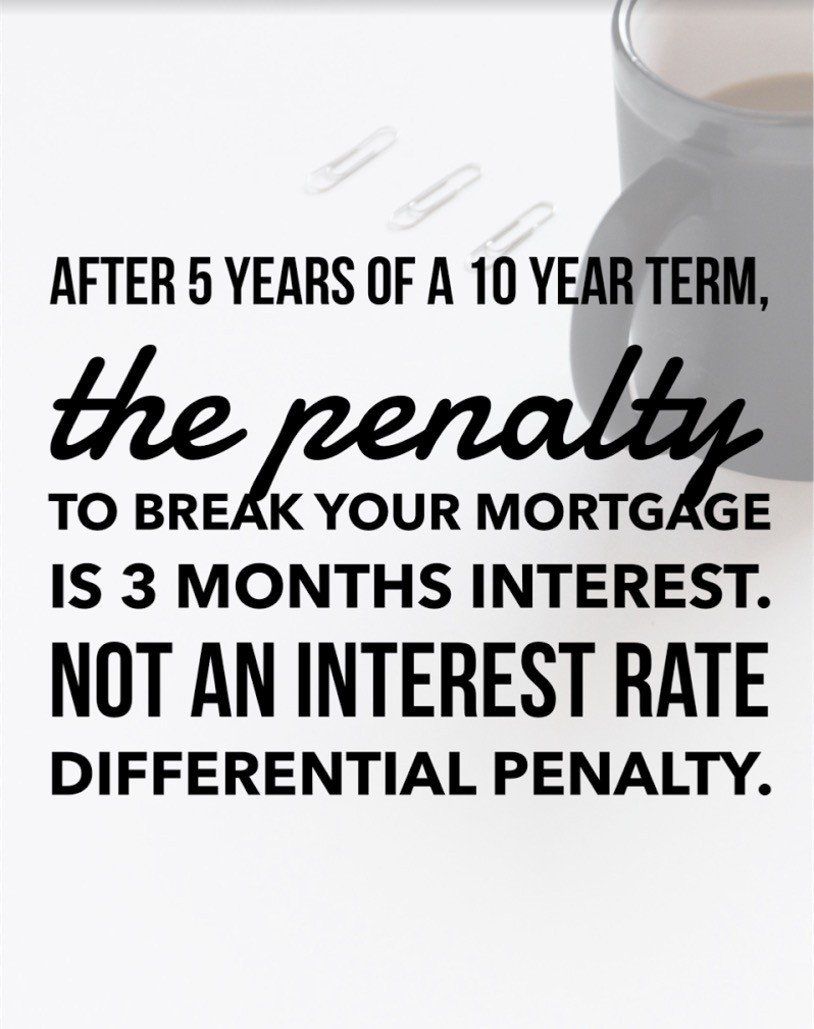 After the first five years of a ten year term has been completed, the penalty to break the mortgage is three months interest, instead of the interest rate differential penalty. That's a really big deal!