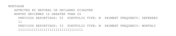 In this scenario, it shows that the mortgage was paid as agreed monthly for 33 months before being deferred for the last two months. It also shows that mortgage payments are currently in deferral.